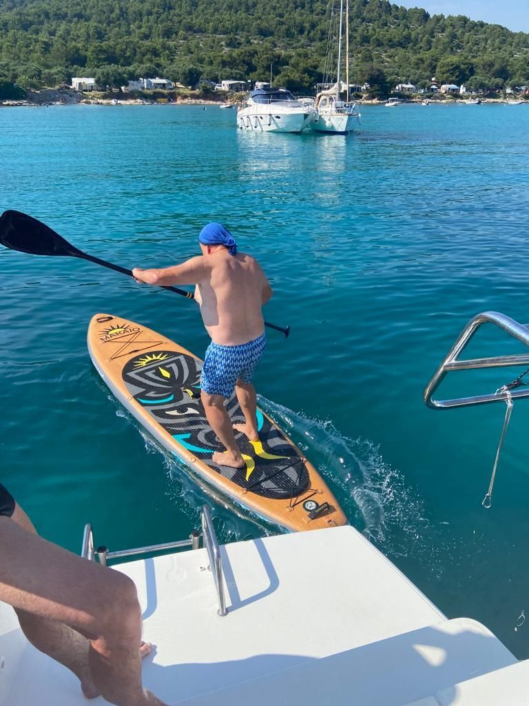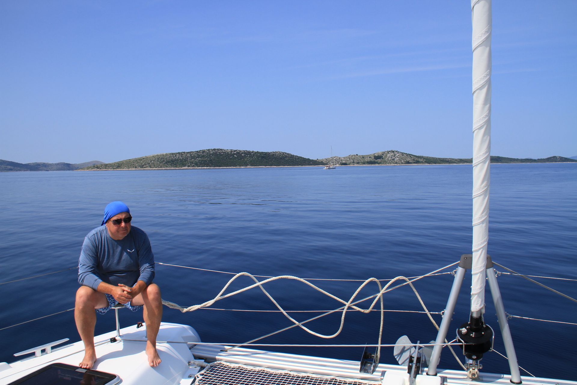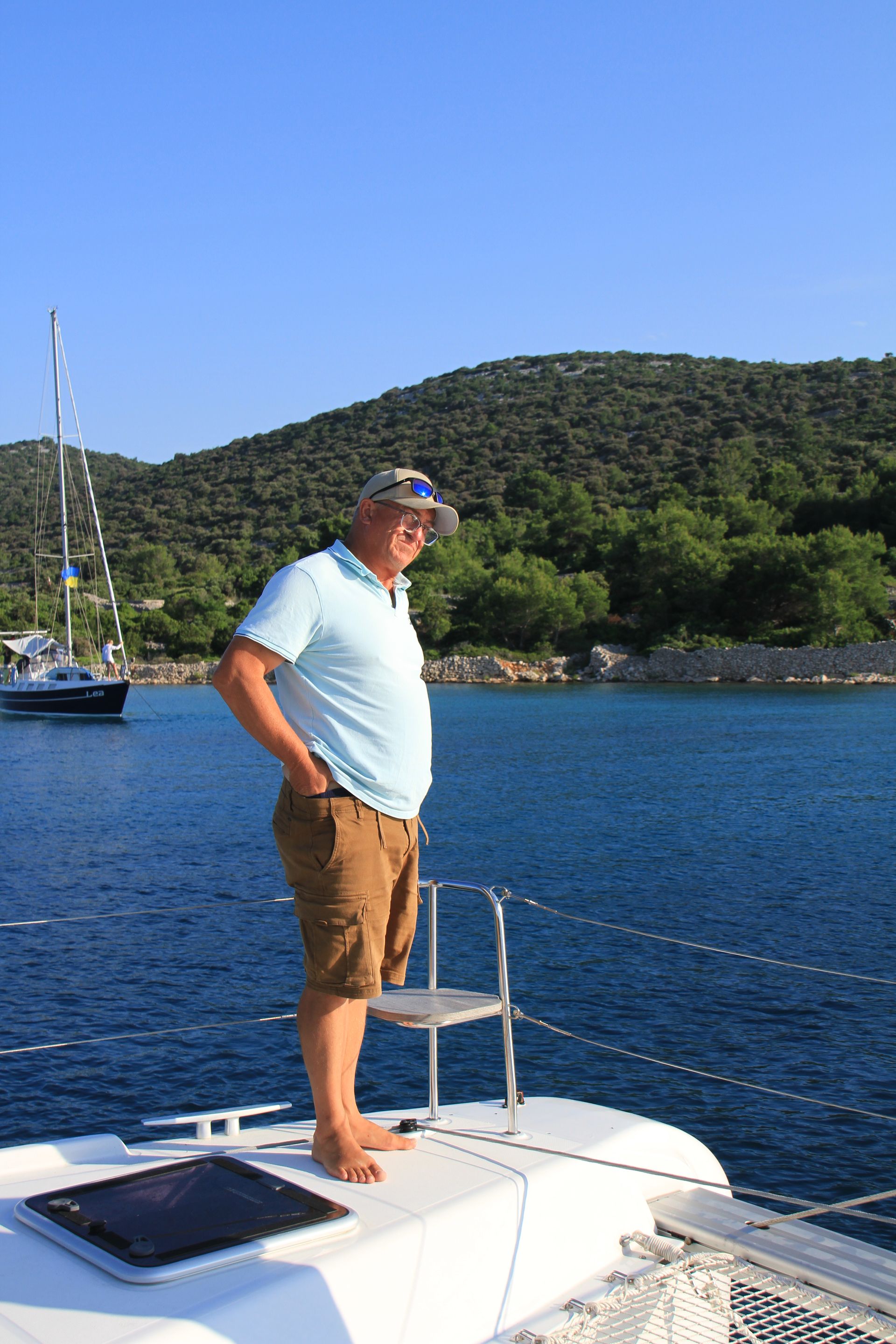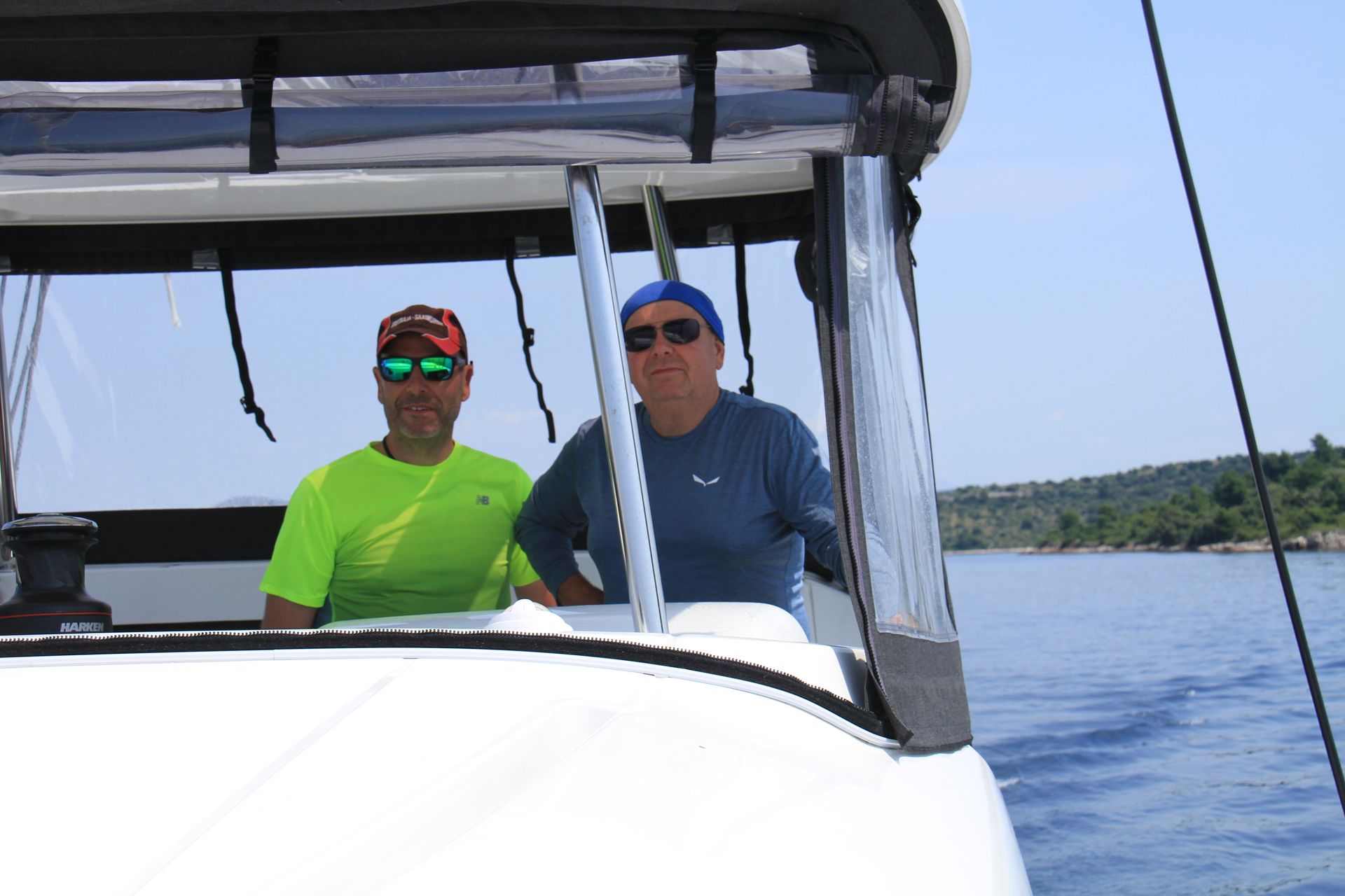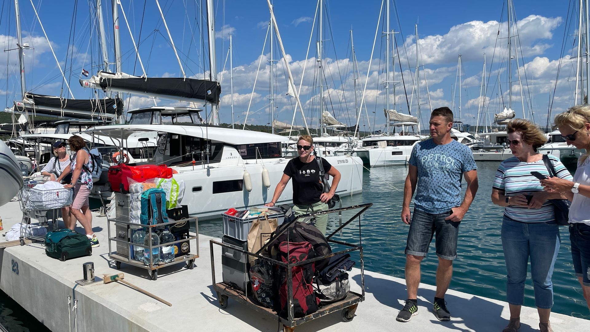 Mit einer Mischung aus Vorfreude und Spannung fahren wir nach Sukusan. Wir müssen noch Proviant einkaufen. Die anderen sechs Mitreisenden (mein Cousin Karsten und Heike, deren Freunde Sven und Angela und wiederum deren Freunde Brita und Ilona) kommen direkt aus Deutschland und sind ebenfalls mit Proviant für eine Woche ausgerüstet. In Sukosan im größten Marinehafen Kroatiens angekommen, suchen wir unseren Katamaran, der am Pier 15 liegt und treffen unseren Skipper Gerhard. Ein netter Typ aus Österreich in fast unserem Alter. Das Boarding beginnt und wir schleppen unseren Proviant an Bord. Wir benötigen zwei Stunden, bis wir alles verstaut haben, inklusive vier aufgepumpte SUP. Unsere Autos sind geparkt. Leinen los!