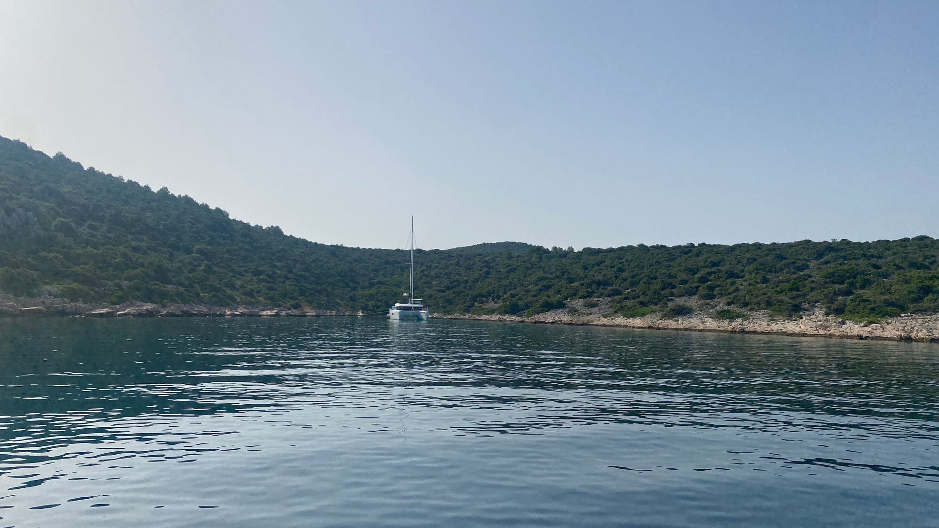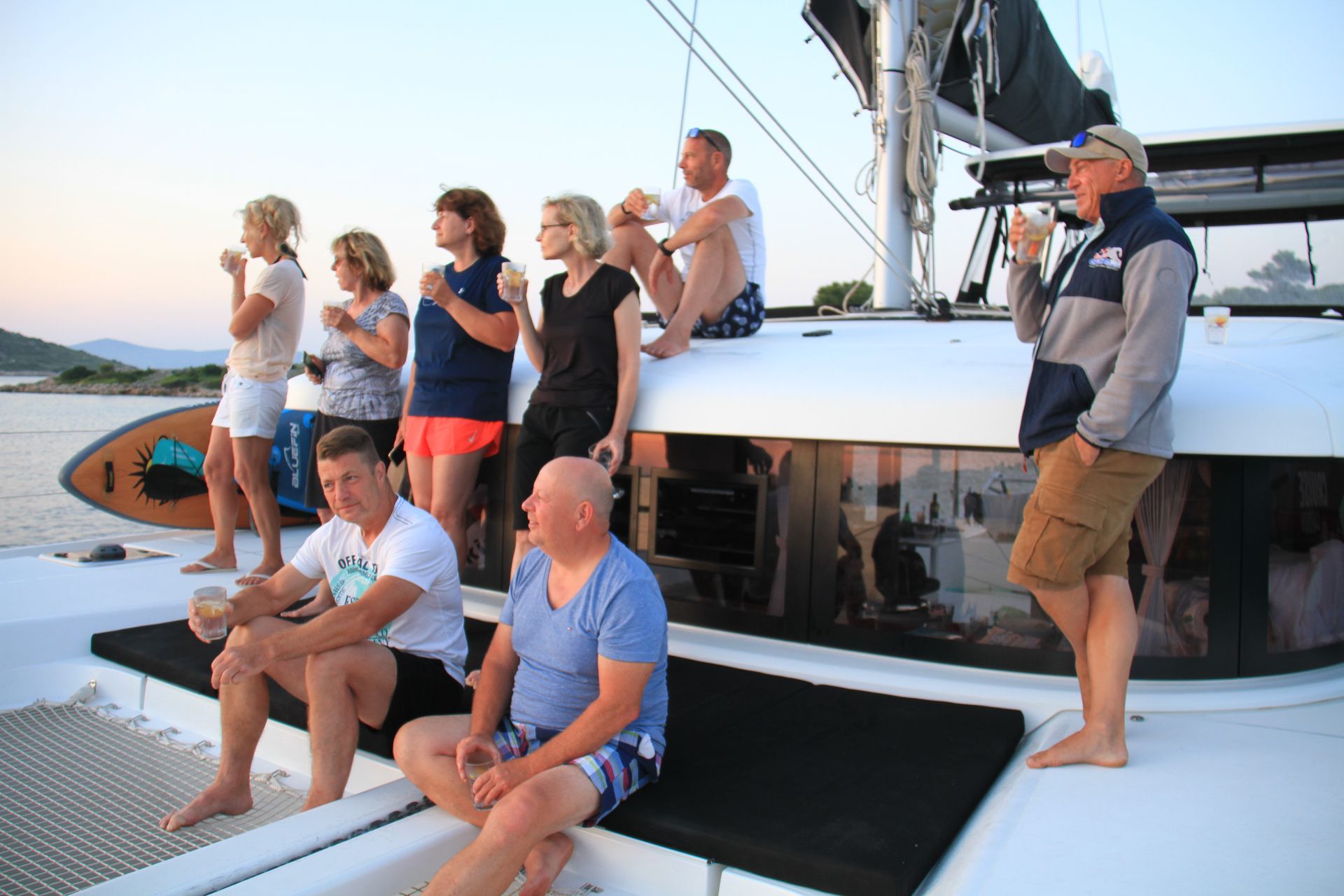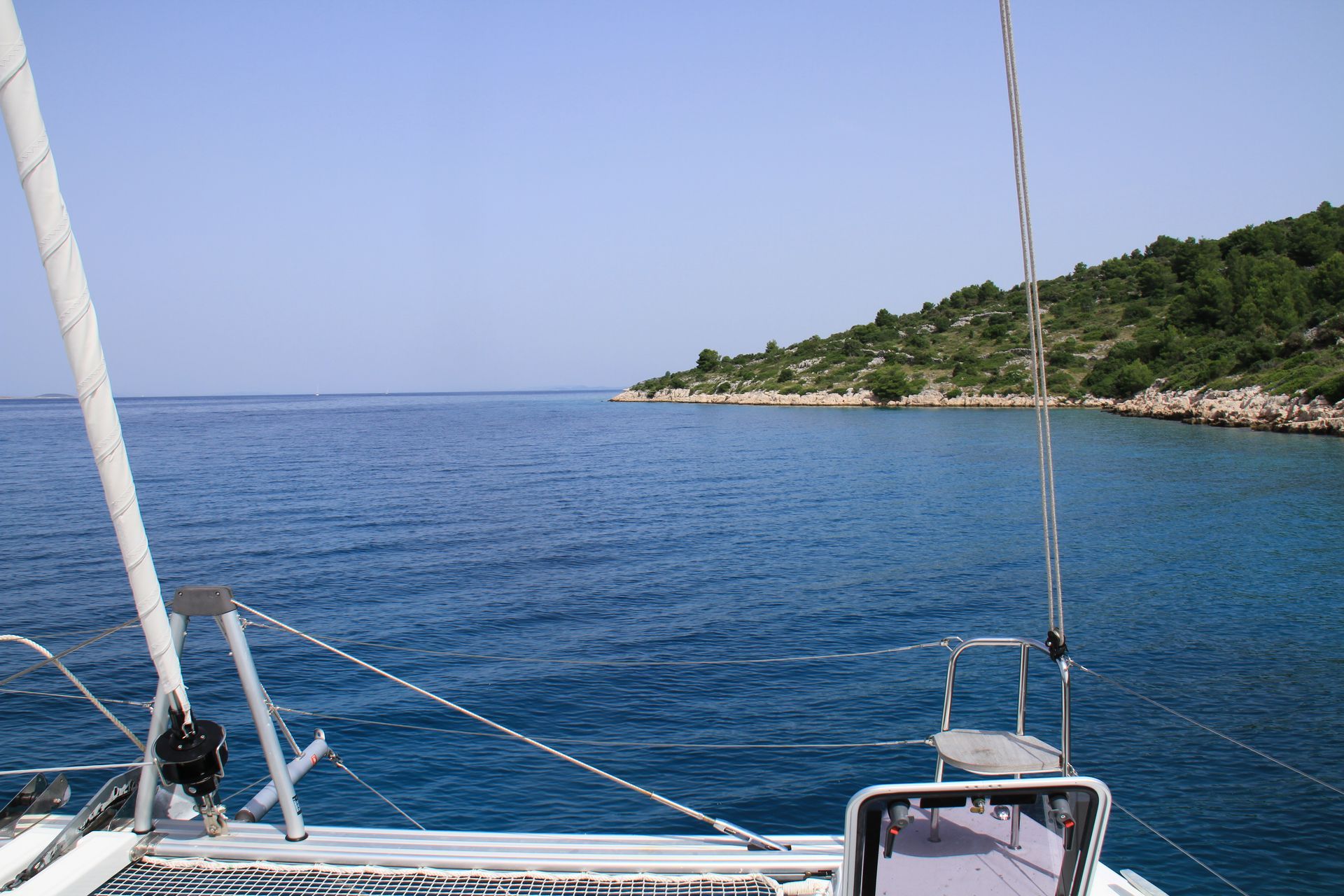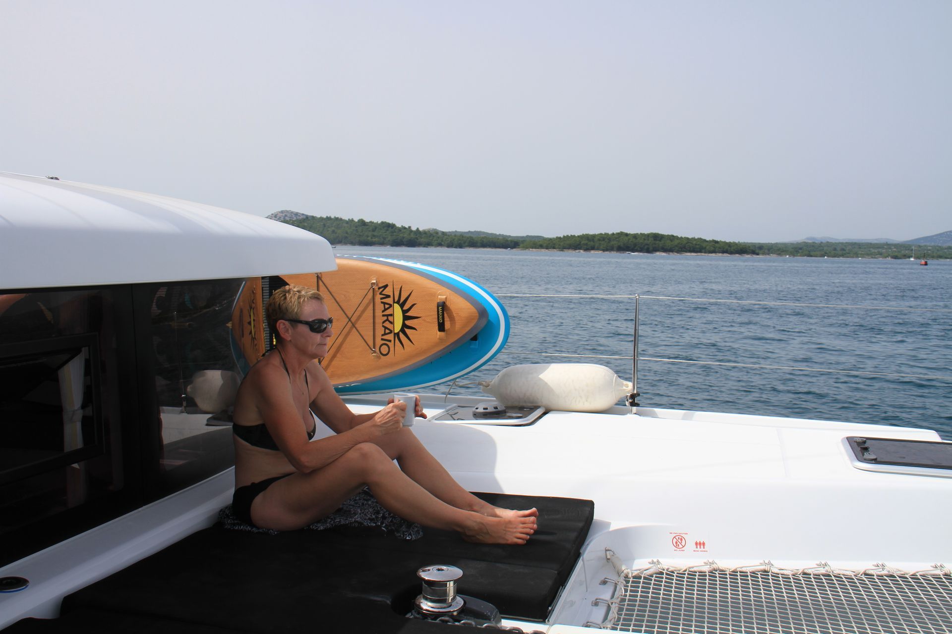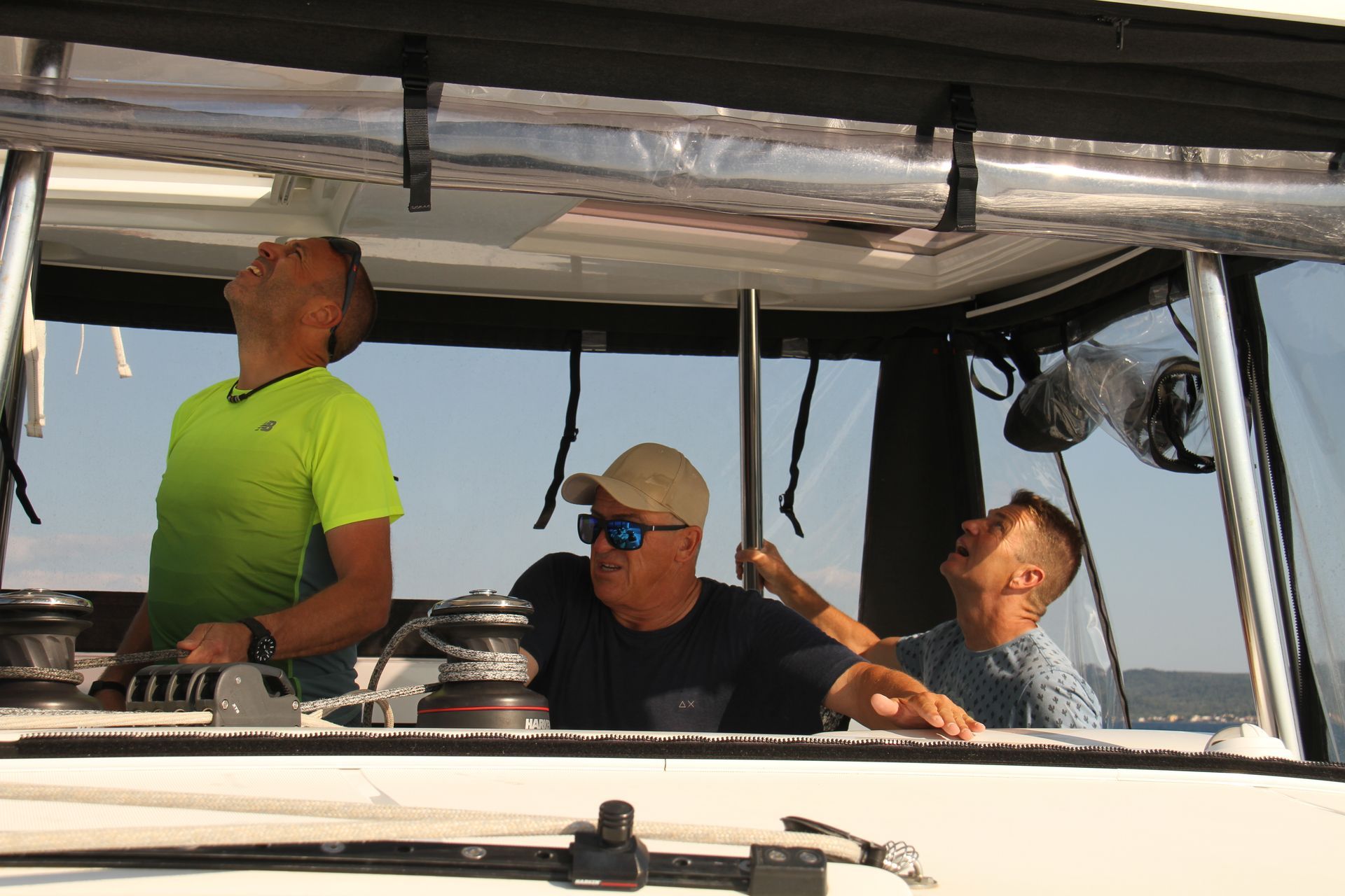 Mit einer Mischung aus Vorfreude und Spannung fahren wir nach Sukusan. Wir müssen noch Proviant einkaufen. Die anderen sechs Mitreisenden (mein Cousin Karsten und Heike, deren Freunde Sven und Angela und wiederum deren Freunde Brita und Ilona) kommen direkt aus Deutschland und sind ebenfalls mit Proviant für eine Woche ausgerüstet. In Sukosan im größten Marinehafen Kroatiens angekommen, suchen wir unseren Katamaran, der am Pier 15 liegt und treffen unseren Skipper Gerhard. Ein netter Typ aus Österreich in fast unserem Alter. Das Boarding beginnt und wir schleppen unseren Proviant an Bord. Wir benötigen zwei Stunden, bis wir alles verstaut haben, inklusive vier aufgepumpte SUP. Unsere Autos sind geparkt. Leinen los!