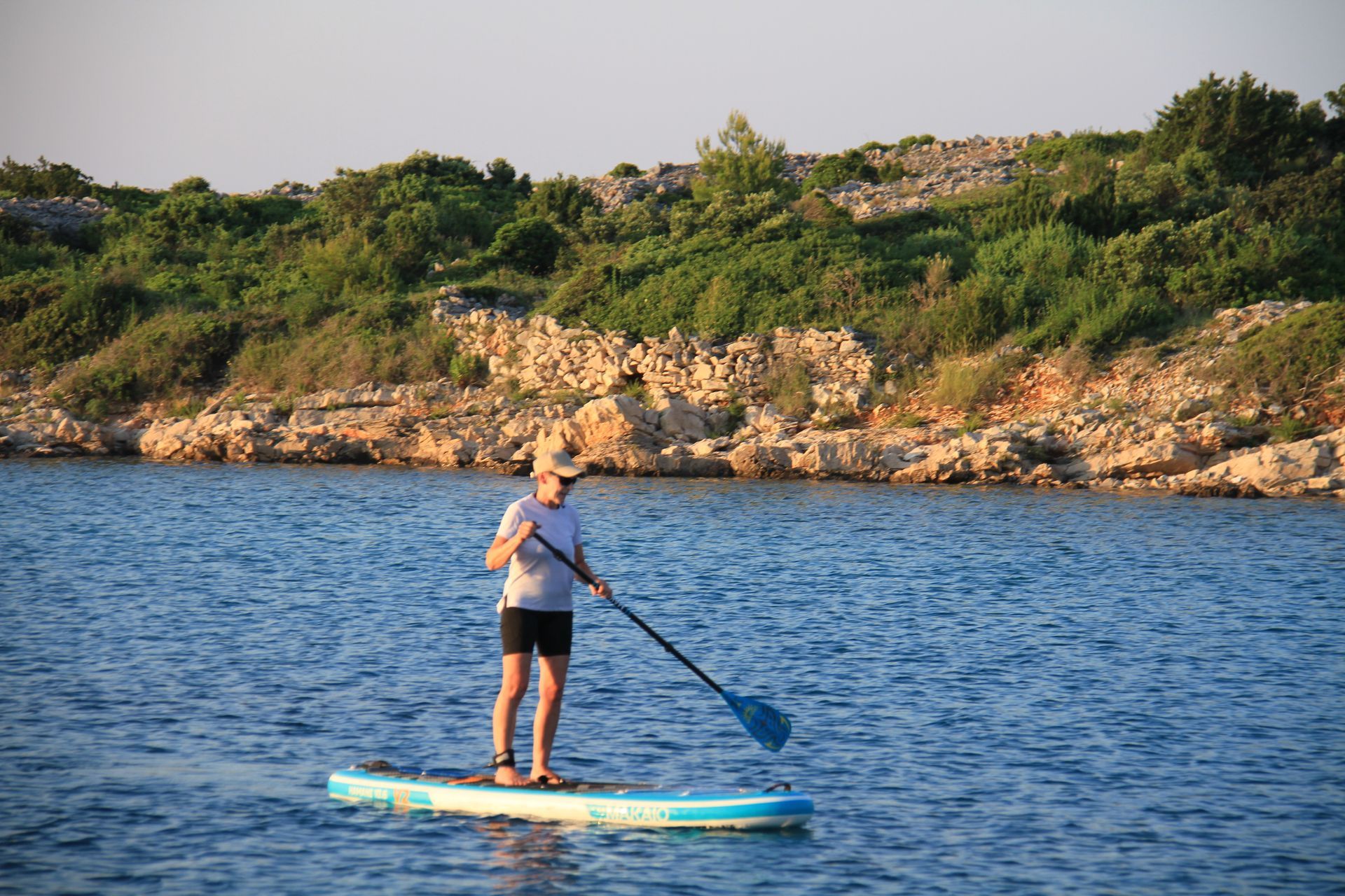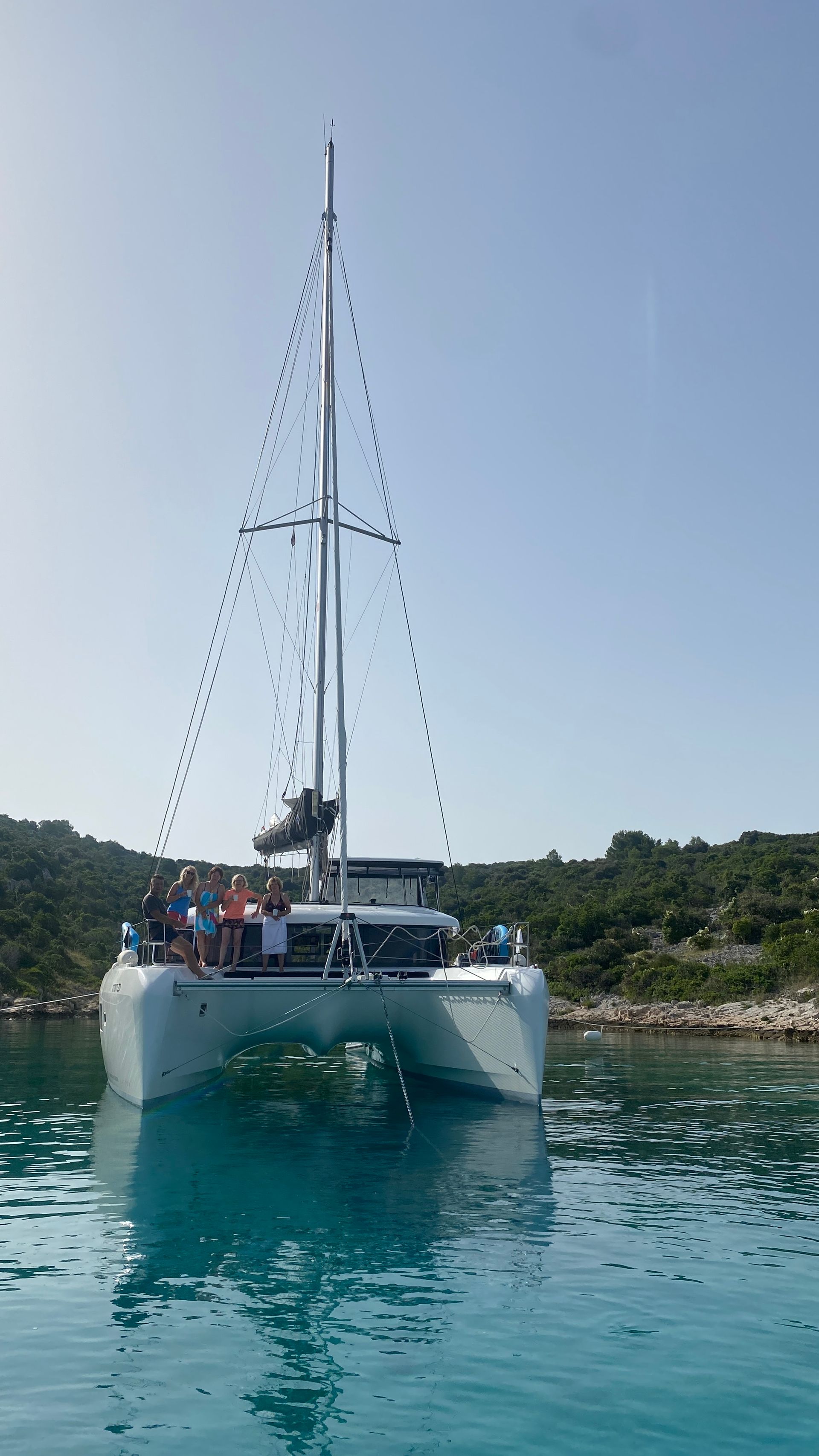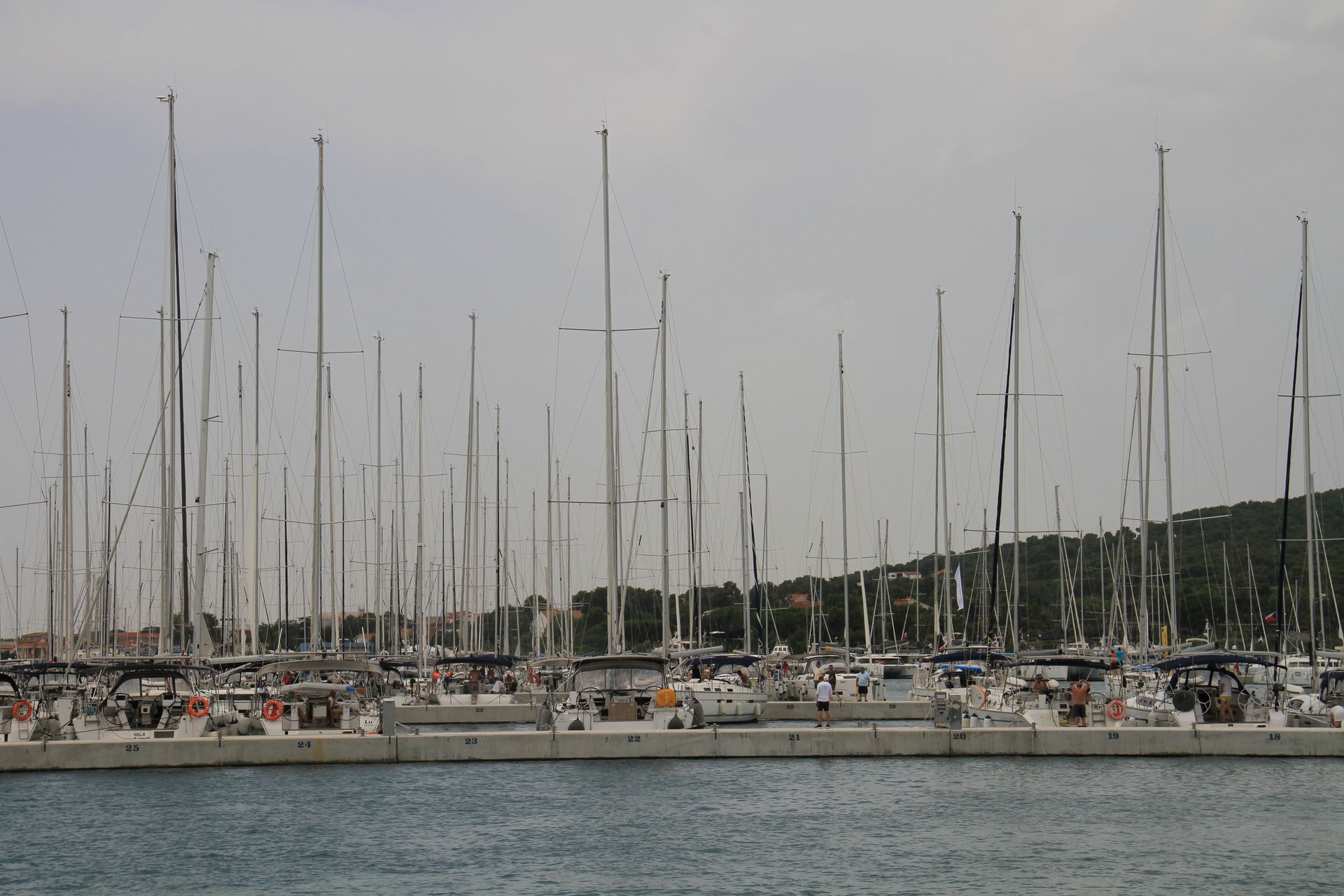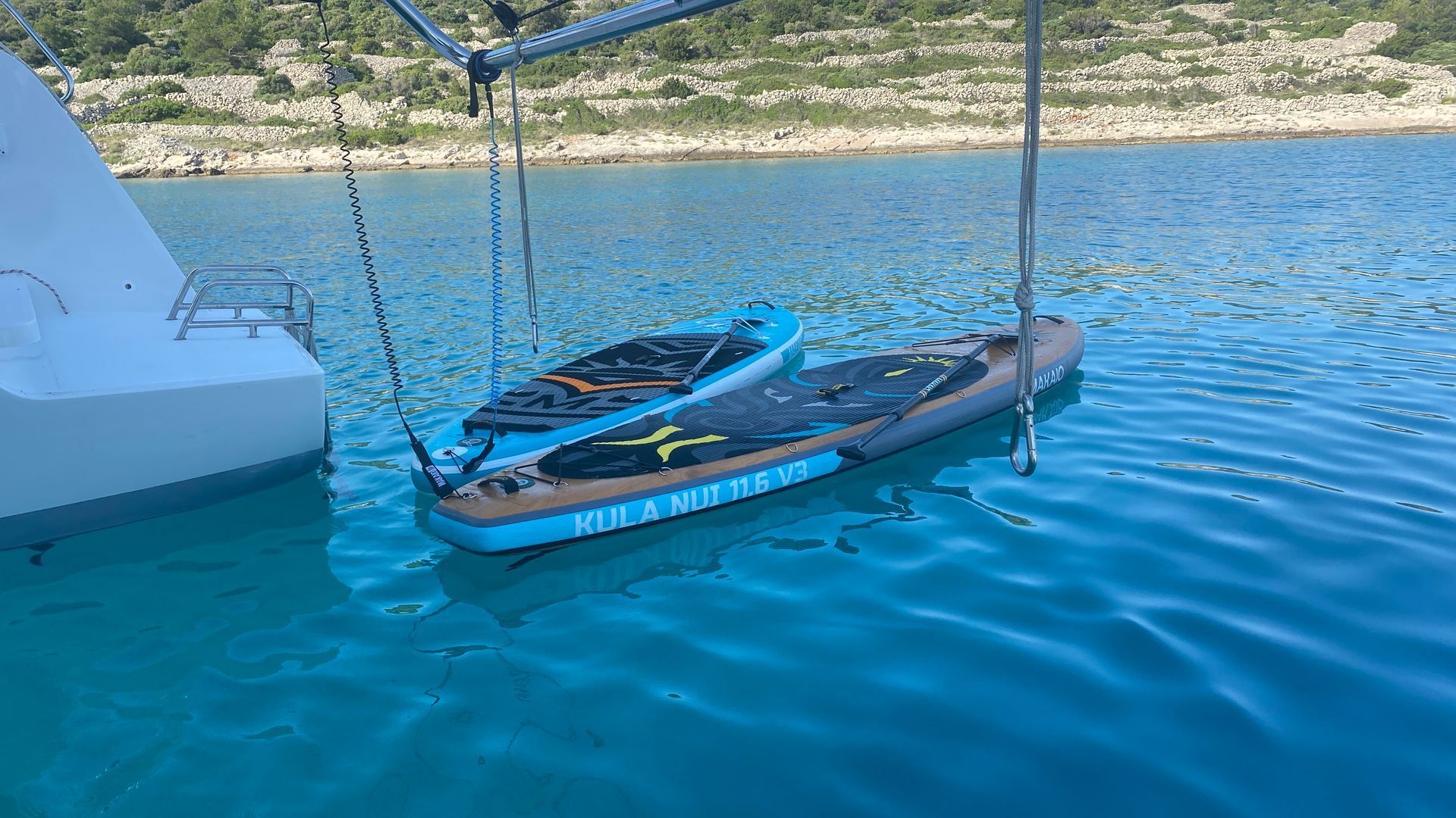Mit einer Mischung aus Vorfreude und Spannung fahren wir nach Sukusan. Wir müssen noch Proviant einkaufen. Die anderen sechs Mitreisenden (mein Cousin Karsten und Heike, deren Freunde Sven und Angela und wiederum deren Freunde Brita und Ilona) kommen direkt aus Deutschland und sind ebenfalls mit Proviant für eine Woche ausgerüstet. In Sukosan im größten Marinehafen Kroatiens angekommen, suchen wir unseren Katamaran, der am Pier 15 liegt und treffen unseren Skipper Gerhard. Ein netter Typ aus Österreich in fast unserem Alter. Das Boarding beginnt und wir schleppen unseren Proviant an Bord. Wir benötigen zwei Stunden, bis wir alles verstaut haben, inklusive vier aufgepumpte SUP. Unsere Autos sind geparkt. Leinen los!