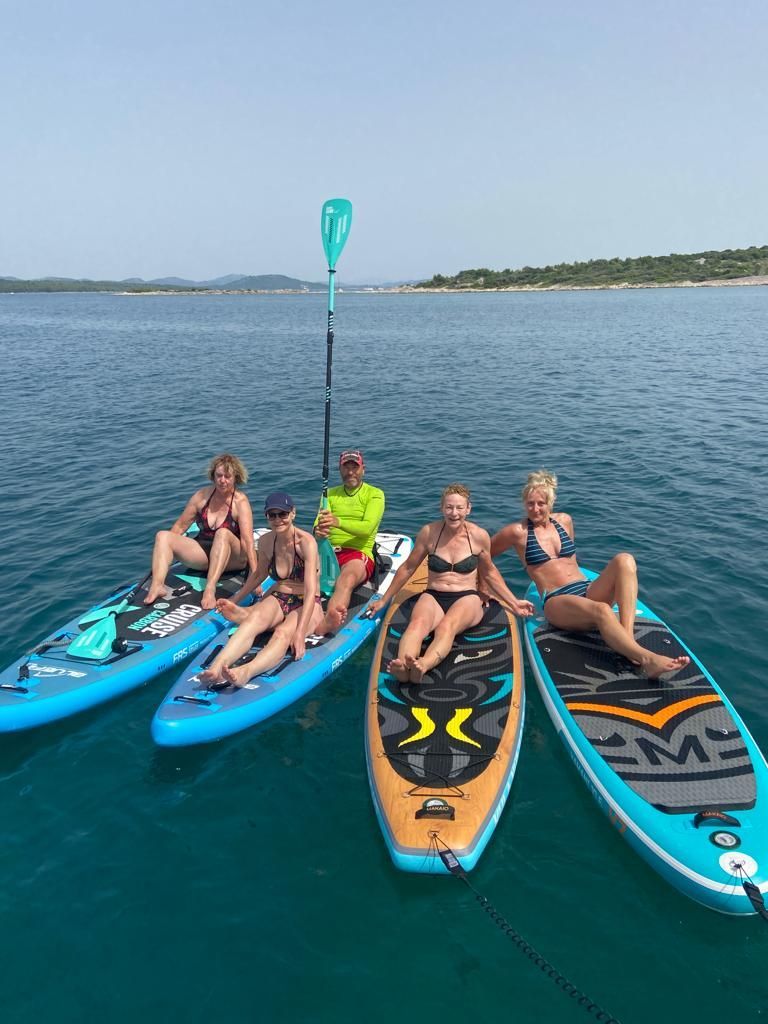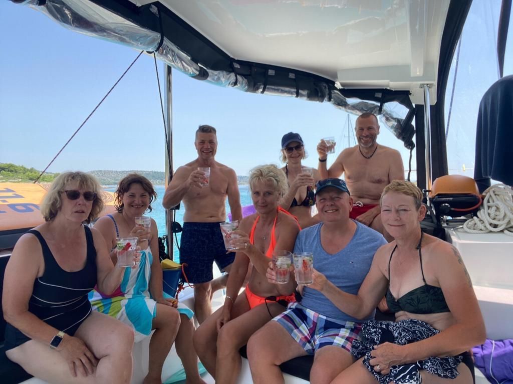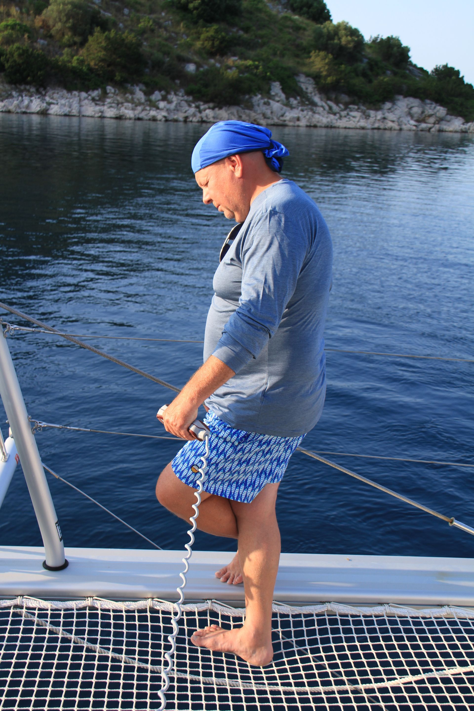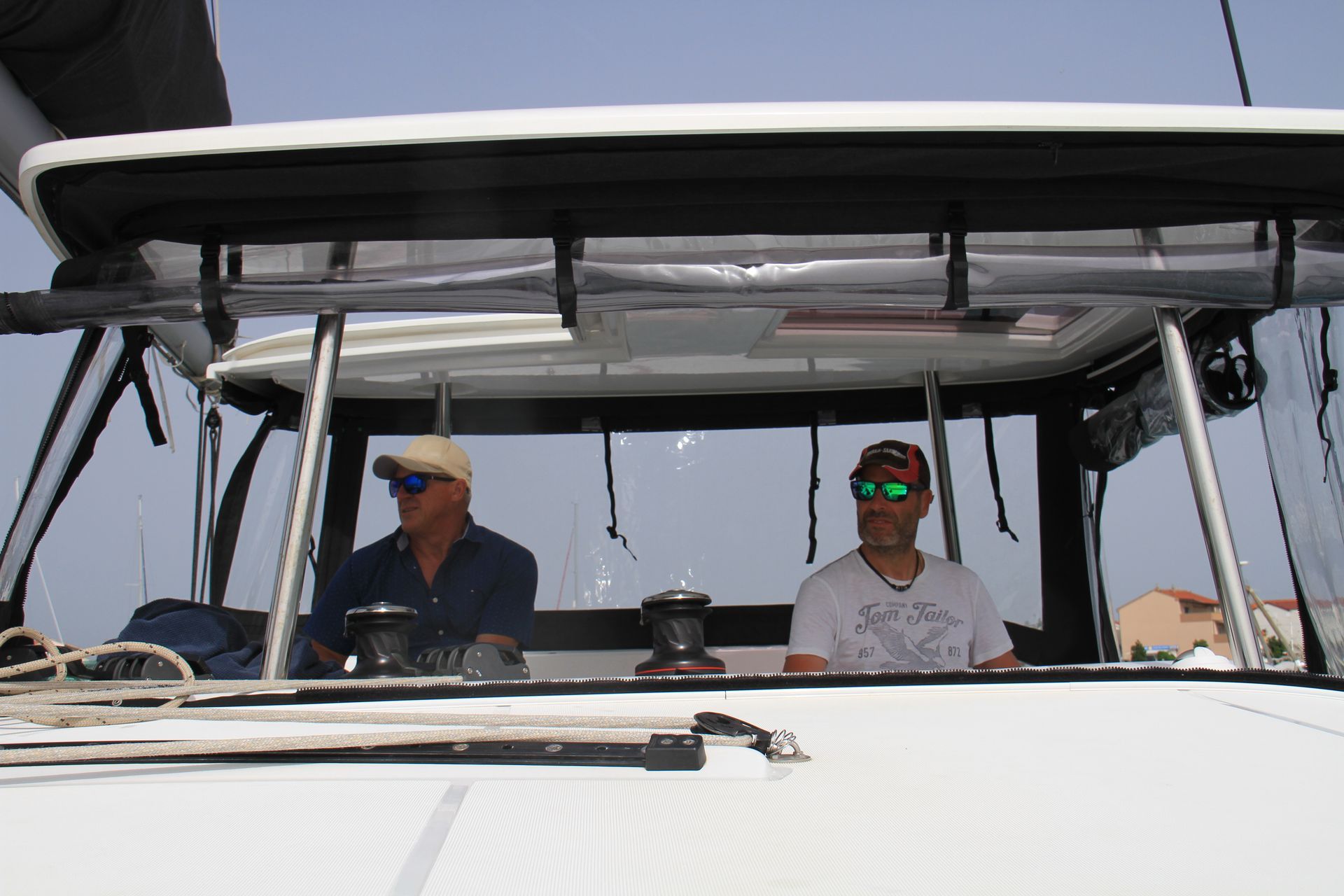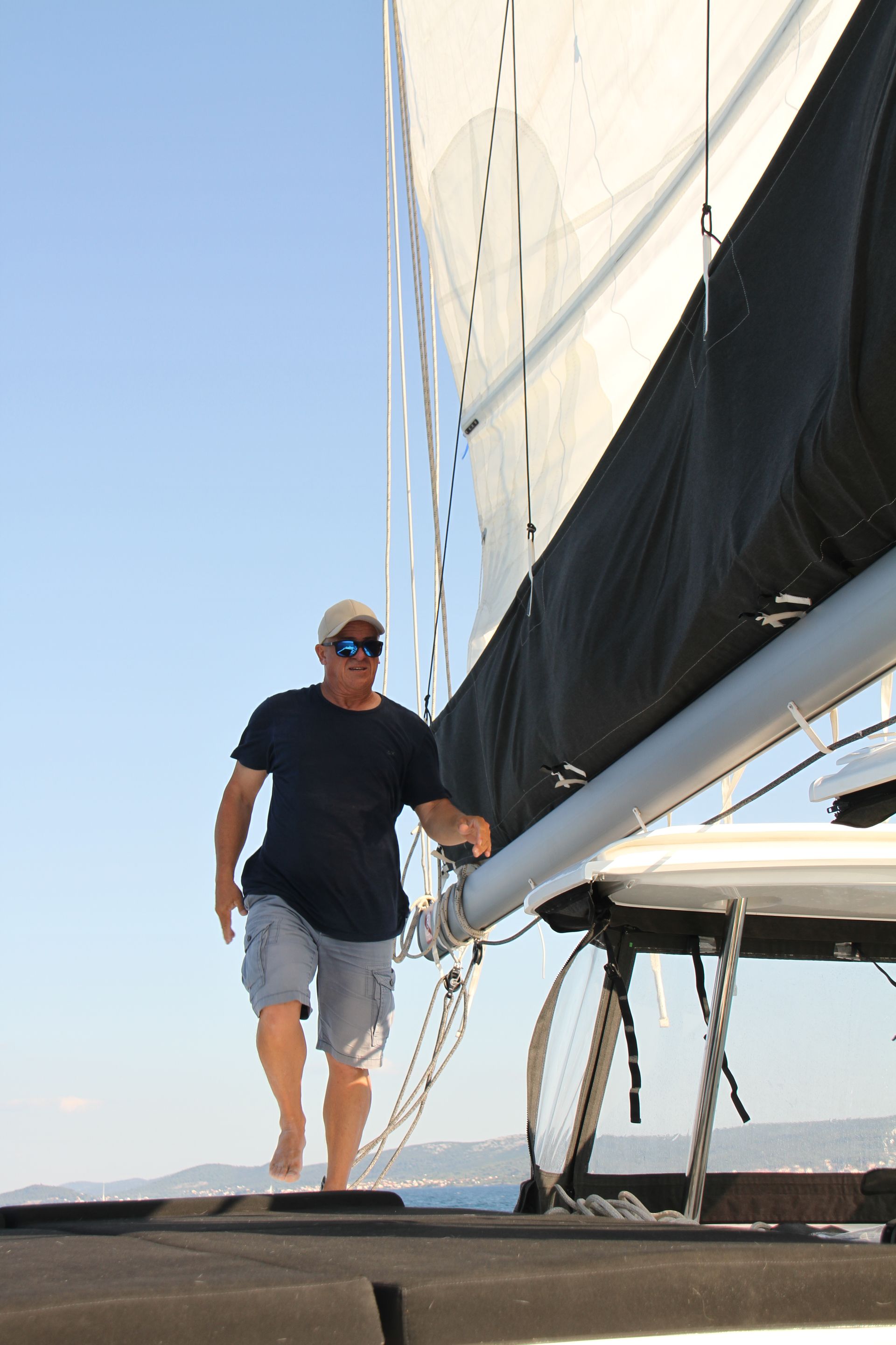 Mit einer Mischung aus Vorfreude und Spannung fahren wir nach Sukusan. Wir müssen noch Proviant einkaufen. Die anderen sechs Mitreisenden (mein Cousin Karsten und Heike, deren Freunde Sven und Angela und wiederum deren Freunde Brita und Ilona) kommen direkt aus Deutschland und sind ebenfalls mit Proviant für eine Woche ausgerüstet. In Sukosan im größten Marinehafen Kroatiens angekommen, suchen wir unseren Katamaran, der am Pier 15 liegt und treffen unseren Skipper Gerhard. Ein netter Typ aus Österreich in fast unserem Alter. Das Boarding beginnt und wir schleppen unseren Proviant an Bord. Wir benötigen zwei Stunden, bis wir alles verstaut haben, inklusive vier aufgepumpte SUP. Unsere Autos sind geparkt. Leinen los!