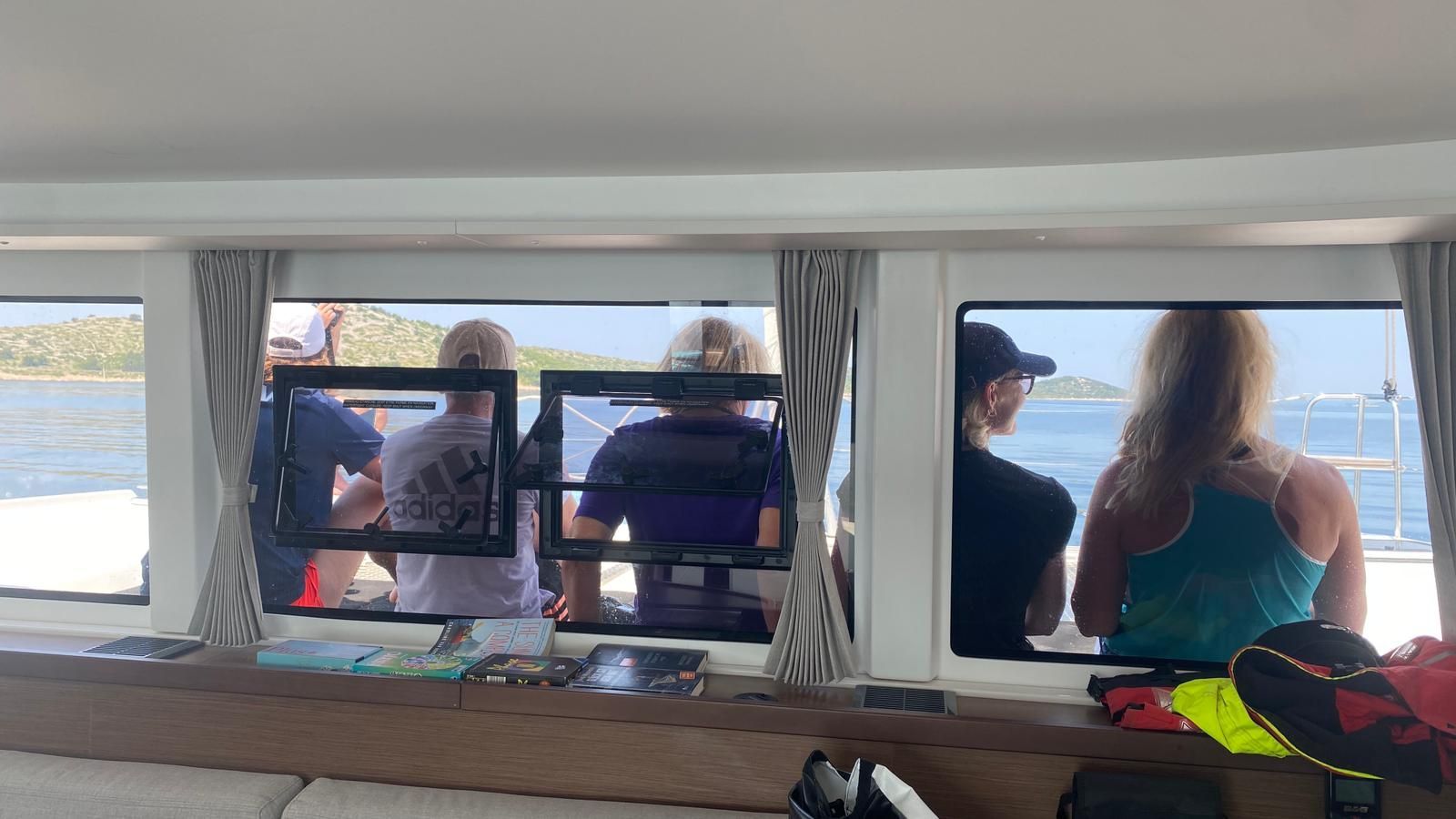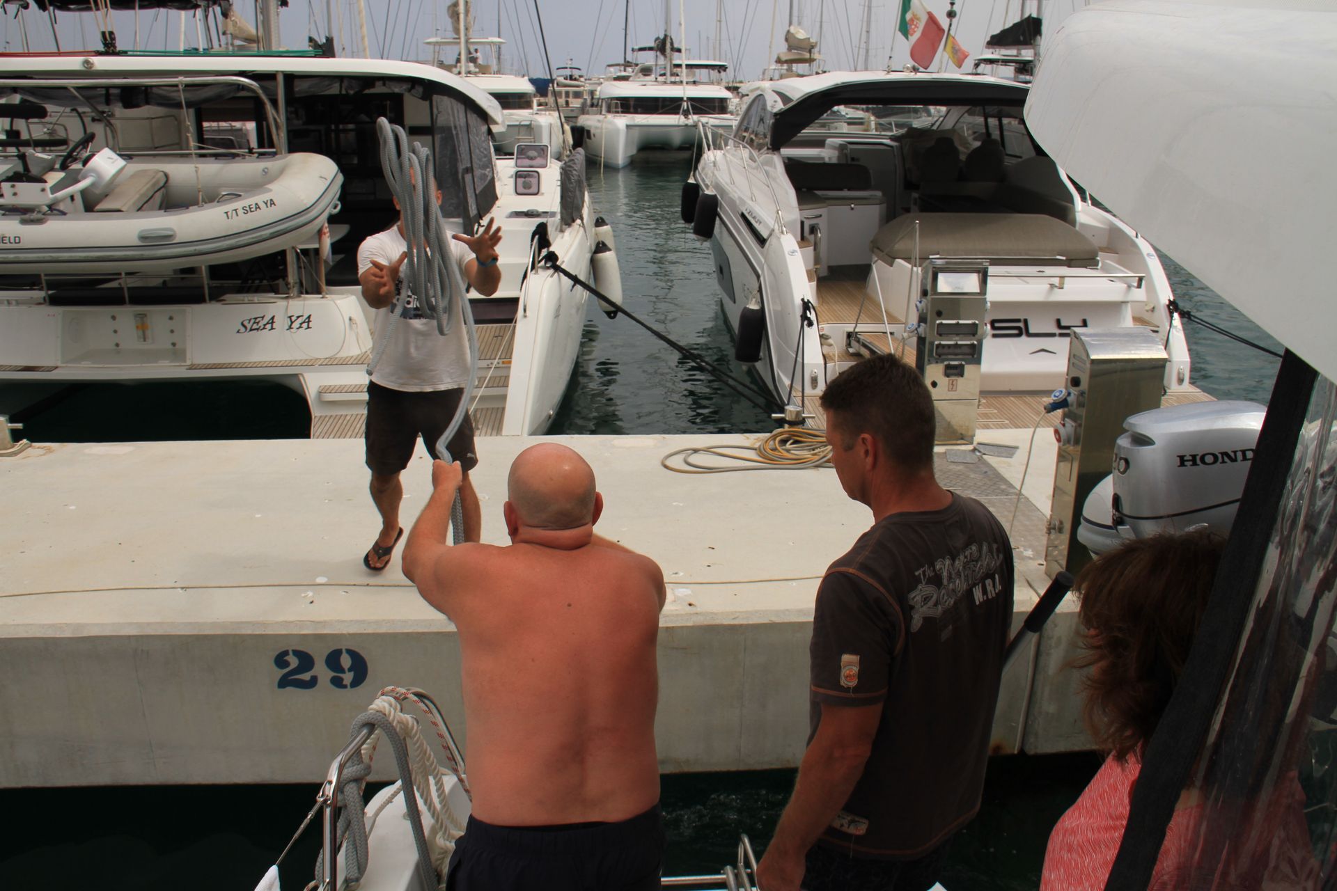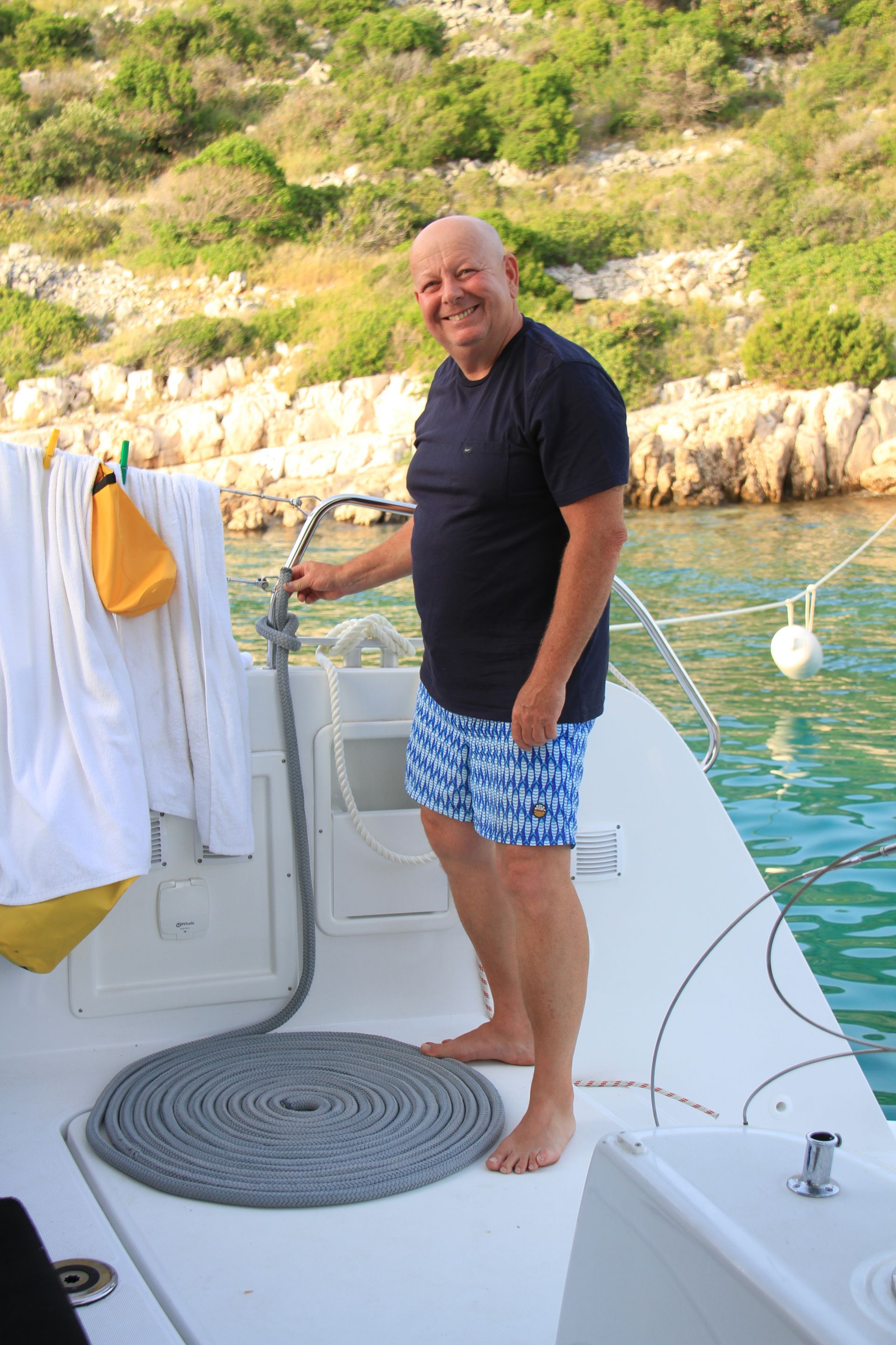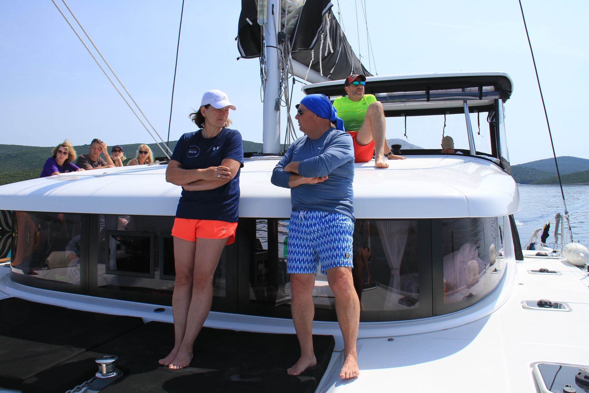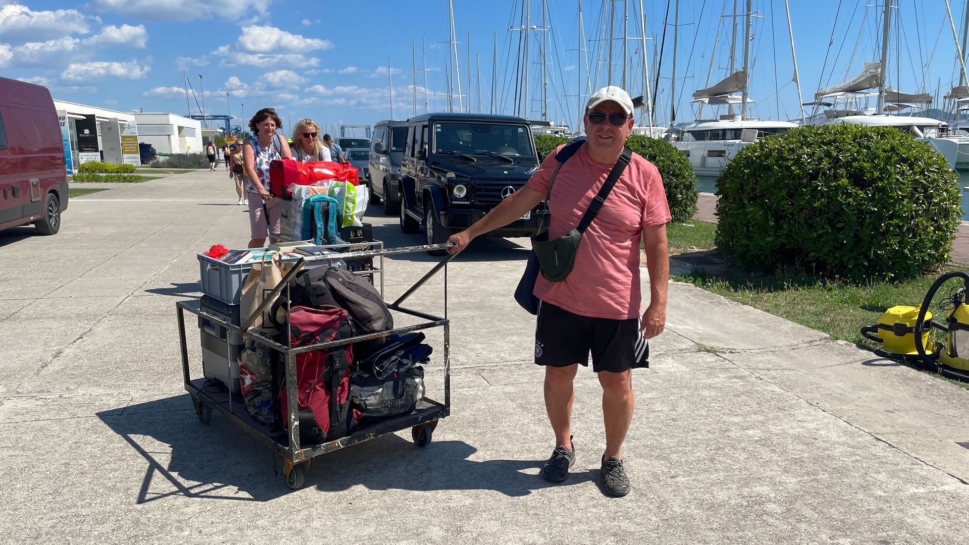 Mit einer Mischung aus Vorfreude und Spannung fahren wir nach Sukusan. Wir müssen noch Proviant einkaufen. Die anderen sechs Mitreisenden (mein Cousin Karsten und Heike, deren Freunde Sven und Angela und wiederum deren Freunde Brita und Ilona) kommen direkt aus Deutschland und sind ebenfalls mit Proviant für eine Woche ausgerüstet. In Sukosan im größten Marinehafen Kroatiens angekommen, suchen wir unseren Katamaran, der am Pier 15 liegt und treffen unseren Skipper Gerhard. Ein netter Typ aus Österreich in fast unserem Alter. Das Boarding beginnt und wir schleppen unseren Proviant an Bord. Wir benötigen zwei Stunden, bis wir alles verstaut haben, inklusive vier aufgepumpte SUP. Unsere Autos sind geparkt. Leinen los!