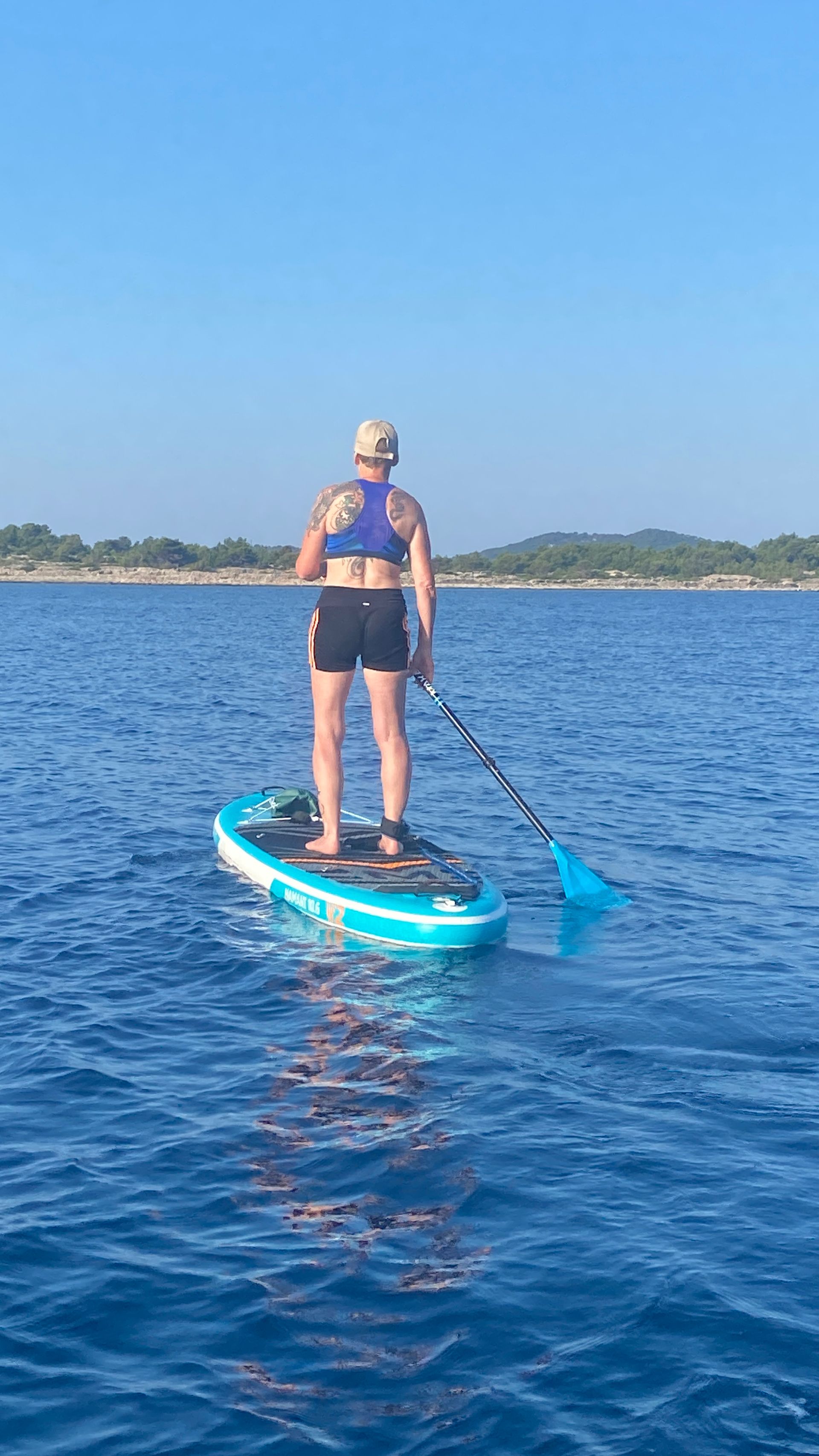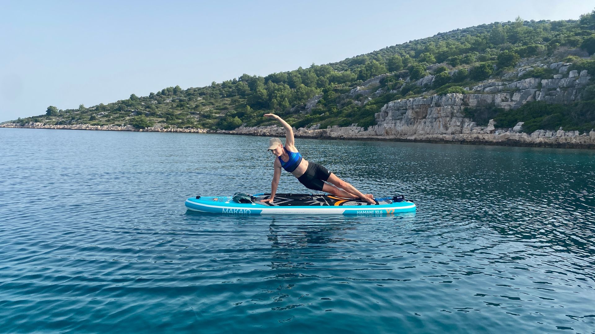 Wir schleichen uns wieder leise von Bord: Paddeln, Pilates, Schwimmen. Herrlich.
